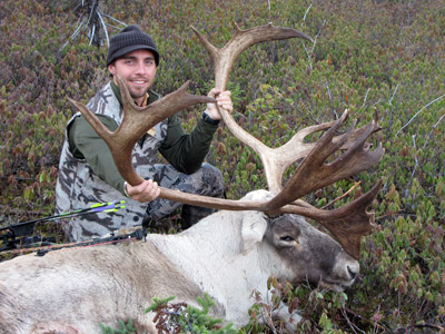 Day four and we were back at it in the same basin. The morning began with sideways rains and wind with no caribou in sight. We did see two bull and two cow moose and tried to put a stalk together but neither the weather nor the animals cooperated. After the attempted stalk on the moose we began to walk, he hiked through some of the thickest timber I have ever seen and spent hours on the move. We came to a high point for some last minute glassing as we were losing faith in this basin and were going elsewhere for the afternoon hunt. The weather began to break, and shortly after we began glassing we spotted the 270 on the same hillside as we did the day before. At this point he was 3 quarters of a mile away and there were two bogs in between us but we knew what we had to do and we high-tailed it over there. We reached the same path as the day before and as we followed it we came across a group of caribou, 5 stags and some cows, with some of the stags sparring. We figured this was the same group that e saw on the 2nd day but we didn’t see the McCormack Stag or the 270. We carefully made our way over and as we approached I saw the 270 up on the hill in the same place as he was the day before. He was in a difficult position to stalk and as we were formulating a plan the McCormack stag walked out and towered over the 270. It was on now; we changed our plan of attacked and worked watched the arrow arc towards him and hit home. We watched the bull slowly walk up the hill less than a hundred yards and bed down. He wouldn’t last long but I slowly stalked closer and released an insurance shot.